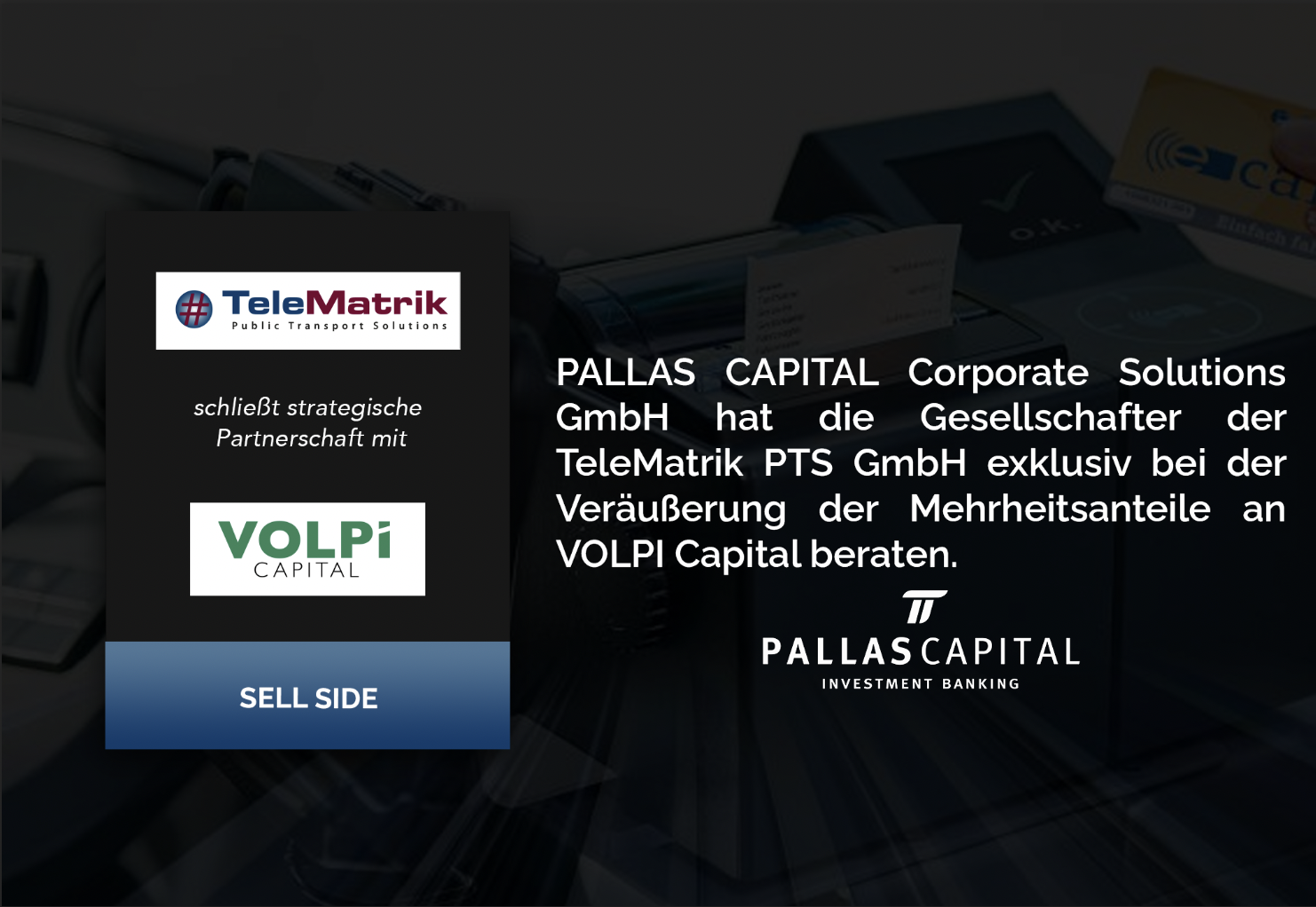 PALLAS CAPITAL Corporate Solutions GmbH hat die Gesellschafter der TeleMatrik PTS GmbH erfolgreich beim mehrheitlichen Verkauf von Unternehmensanteilen an den in London ansässigen Finanzinvestor Volpi Capital beraten. Die Transaktion stellt eine strategische Plattforminvestition dar, die es TeleMatrik ermöglicht, neue Märkte zu erschließen und das Produktportfolio gezielt weiterzuentwickeln. Nach erfolgreichem Abschluss der vereinbarten Übergangsphase kann die Transaktion nun offiziell bekannt gegeben werden.